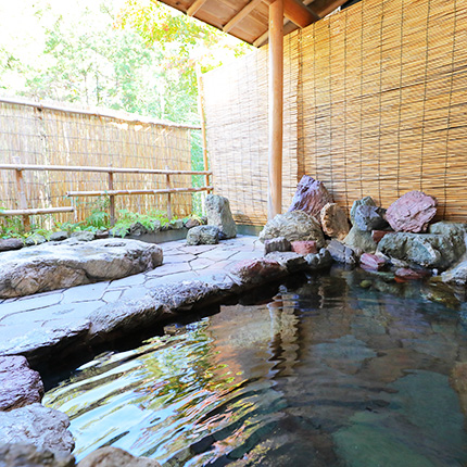 「御宿 竹取物語」のお風呂は、小鹿野温泉大竜寺源泉の貸切が3種類あります。日常を忘れる自然に没入し、優雅なリフレッシュタイムを過ごします。