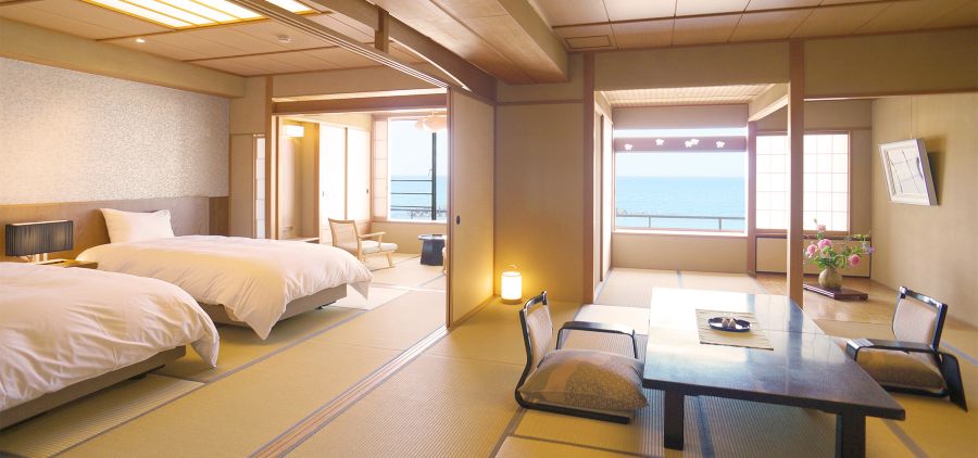 山形へのカップル旅行は、和風デラックスツインルームを予約してください。広々としたベッドルームにオーシャンビューの広縁で、贅沢なリラックスタイムを過ごせます。