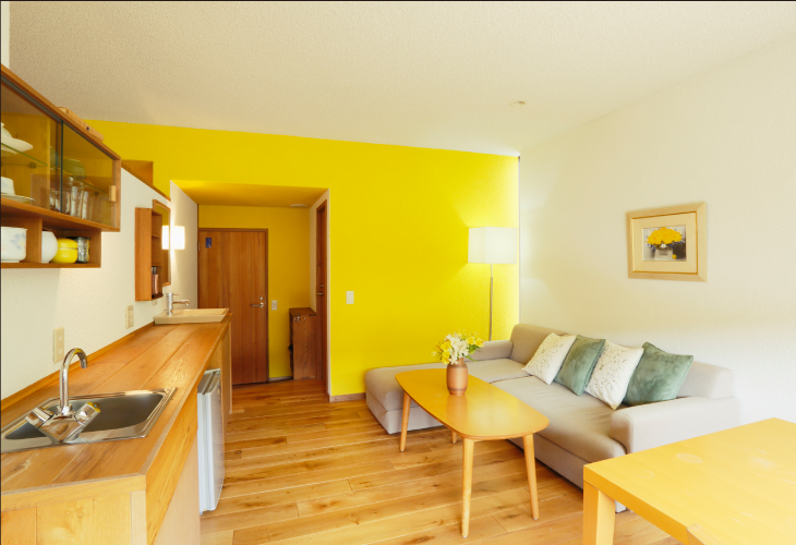 客室は、半露天風呂付き3部屋、洋室1部屋、スタンダード1部屋です。すべての客室がリビングキッチンを備え、連泊ステイや記念日のサプライズデザートなどにおすすめです。