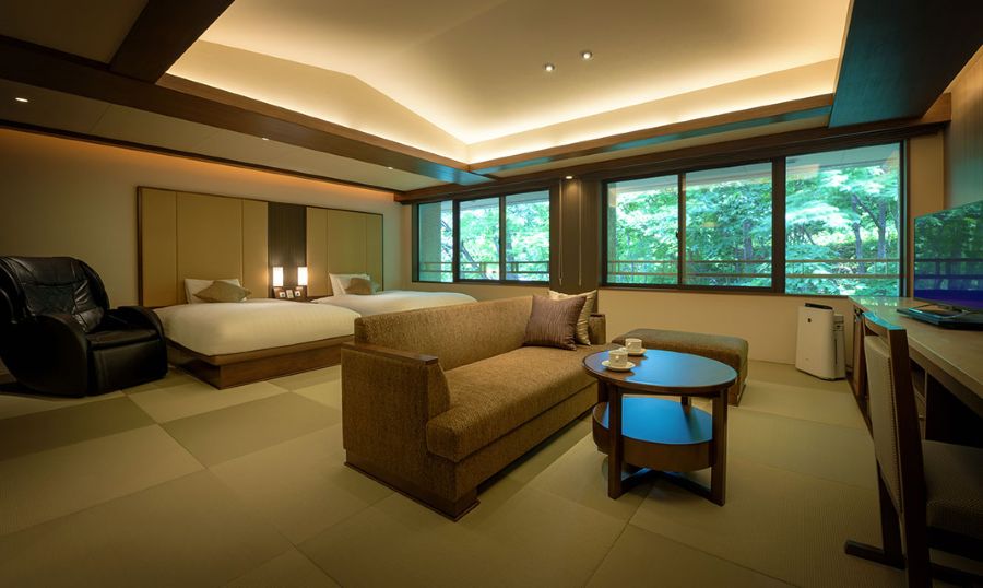 客室は、展望露天風呂付や贅沢なプレミアムスイートなどを展開。カップルで記念の旅行は、ルーフトップテラス付の部屋を予約してください。