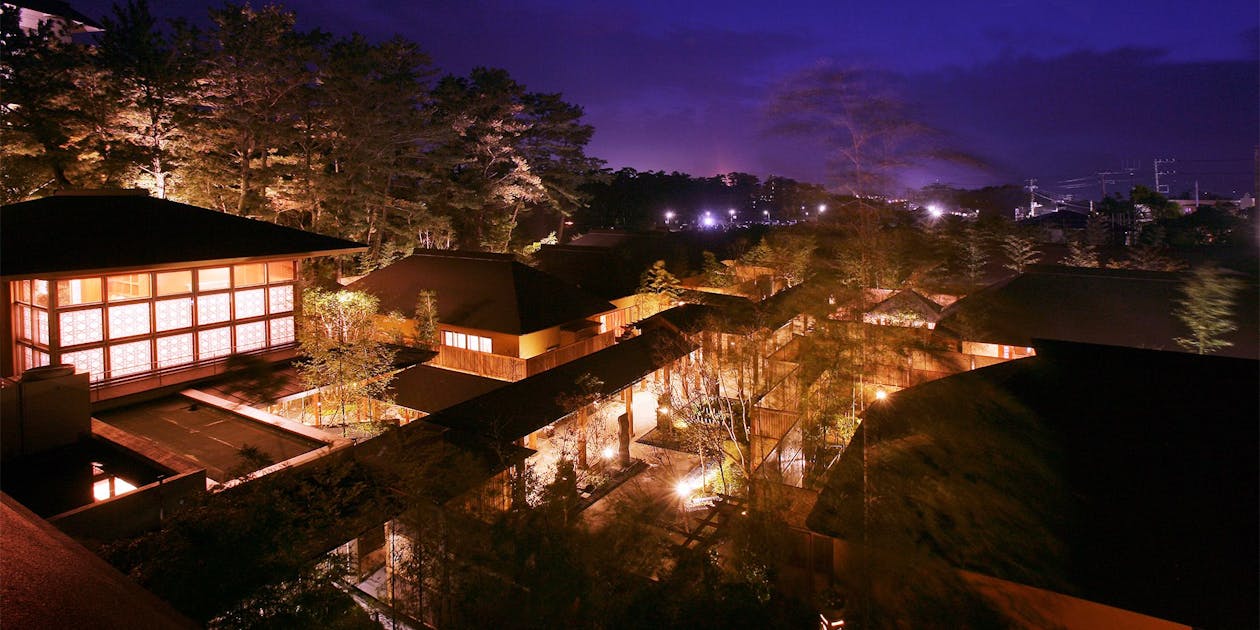 構造としては内側にレストランや大浴場で、外側に客室が並んでいます。部屋はすべて、源泉かけ流し露天風呂付きにより、彼女と癒しのときを独占できます。